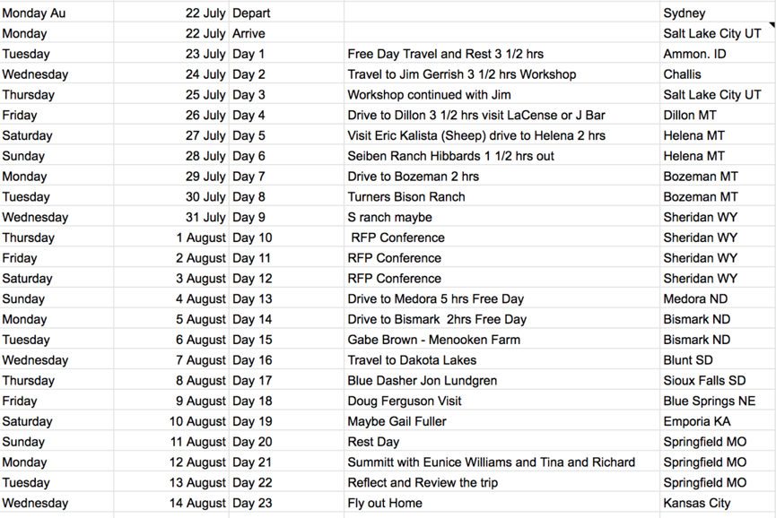 This is the current itinerary and whilst subject to some changes, it is pretty much how it all will roll. I am waiting for some confirmations however: 1. Jim Gerrish Masterclass is confirmed 2. Hibbard ranch visit is confirmed. 3. The RFP conference is confirmed. 4. Gabe Brown is Confirmed.